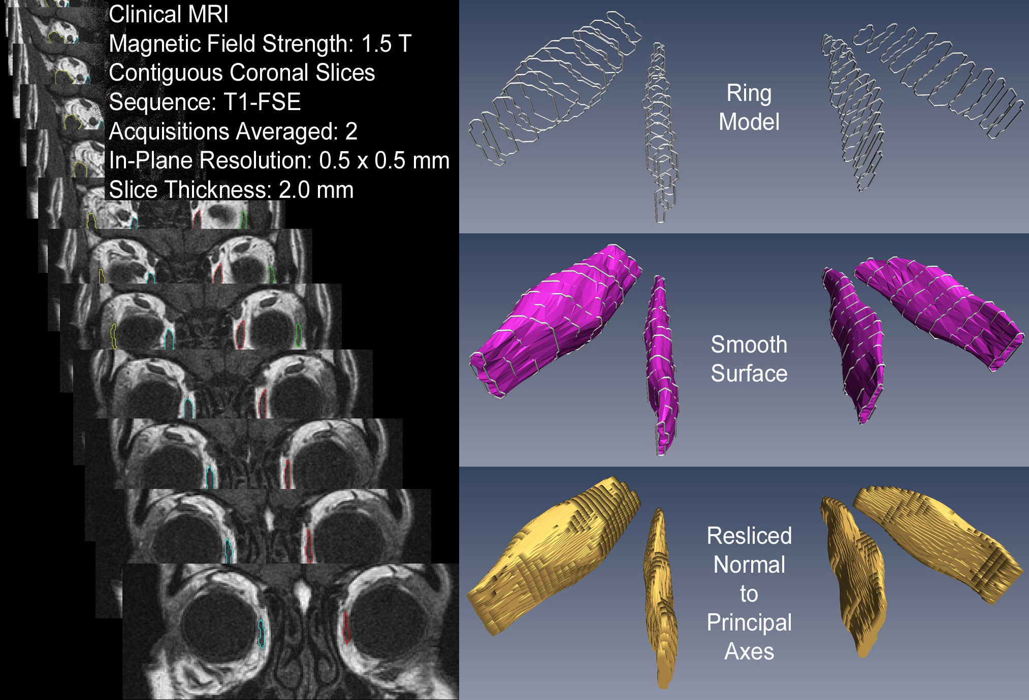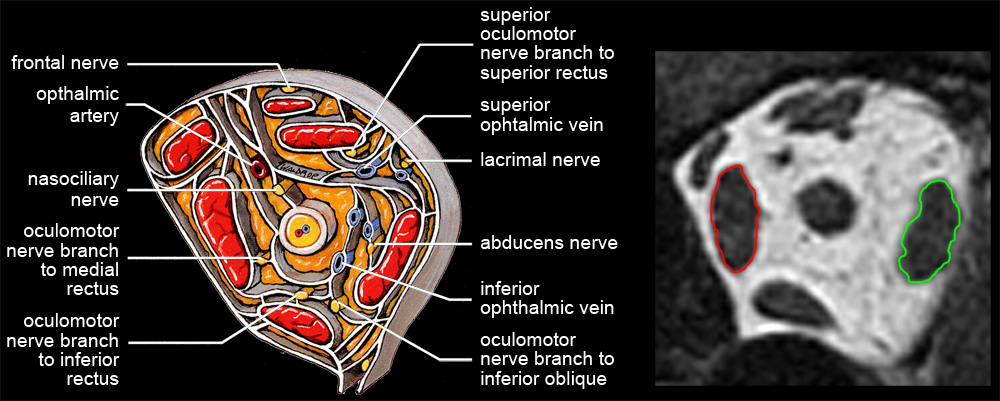 Many studies have been performed using the MRI image analysis techniques we introduced ( Miller 1989 ) to estimate extraocular muscle paths, shapes, and sizes, demonstrating, for instance, EOM pulleys (Miller, Demer et al. 1993) and the hypertrophy resulting from bupivacaine injection (Miller, Scott et al. 2013). Unfortunately, some studies have also used the presumptive precision and objectivity of MRI to draw very dubious conclusions. Although no methodology can ensure good science, almost three decades of experience suggest refinements that would generally improve the reliability of quantitative extraocular MRI. Accordingly, we review four aspects of scan analysis necessary for accurate volume estimates and muscle crossections without projection correction, and address some of the errors and biases that can affect MRI quantification. An example of these improved techniques can be found in Miller et al (2013). |